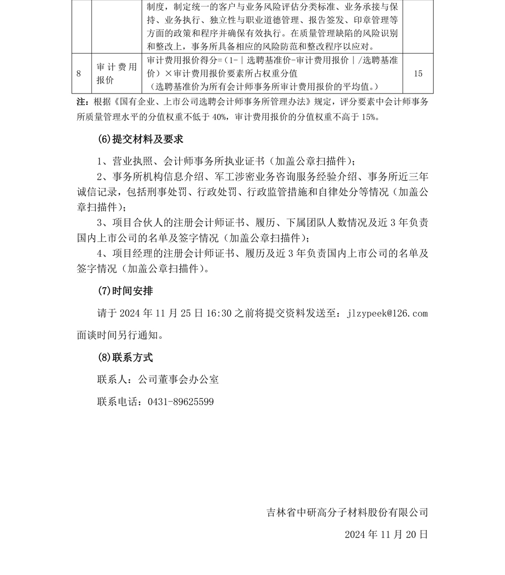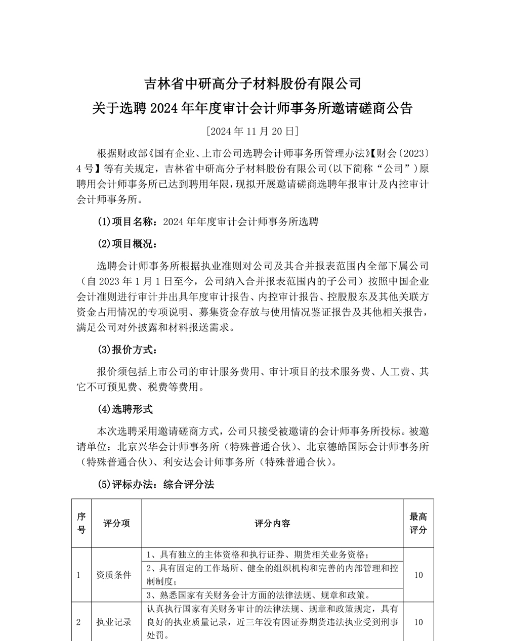 吉林省中研高分子材料股份有限公司關(guān)于選聘2024年年度審計會計師事務(wù)所邀請磋商公告